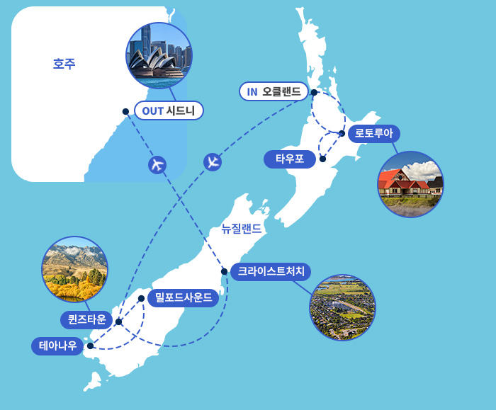 인천-기내(1)- 오클랜드/로토루아(1)-타우포/로토루아(1)-오클랜드(1)-퀸즈타운/테아나우(1)-밀포드사운드/퀸즈타운(1)-크라이스트처치(1)-시드니(2)-인천